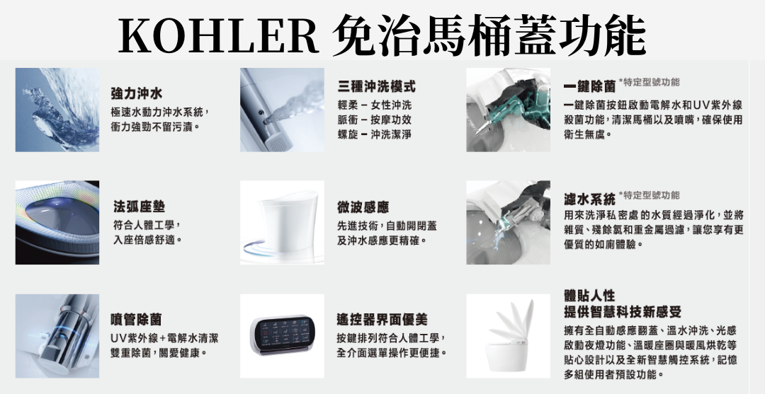 • KOHLER 免治馬桶蓋:除了基本功能外,還包含更多智能功能,如自動感應開關蓋、個人化設定、氣味清新系統,以及座圈除菌的功能