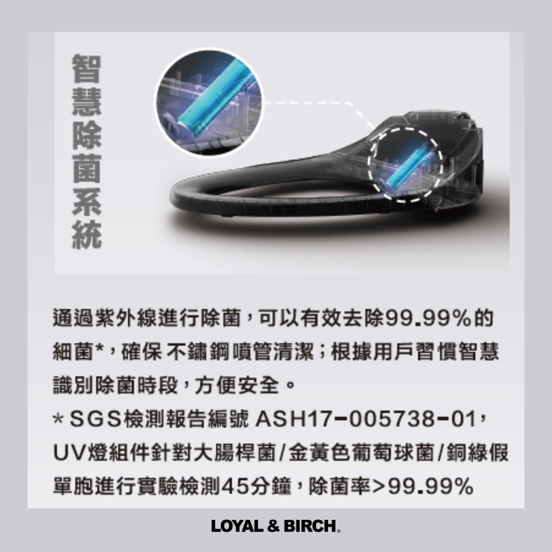 ➊ 智感除菌系統:透過UV紫外線進行除菌,保持噴管清潔;還能根據使用者習慣智慧辨識除菌時段,方便又安全