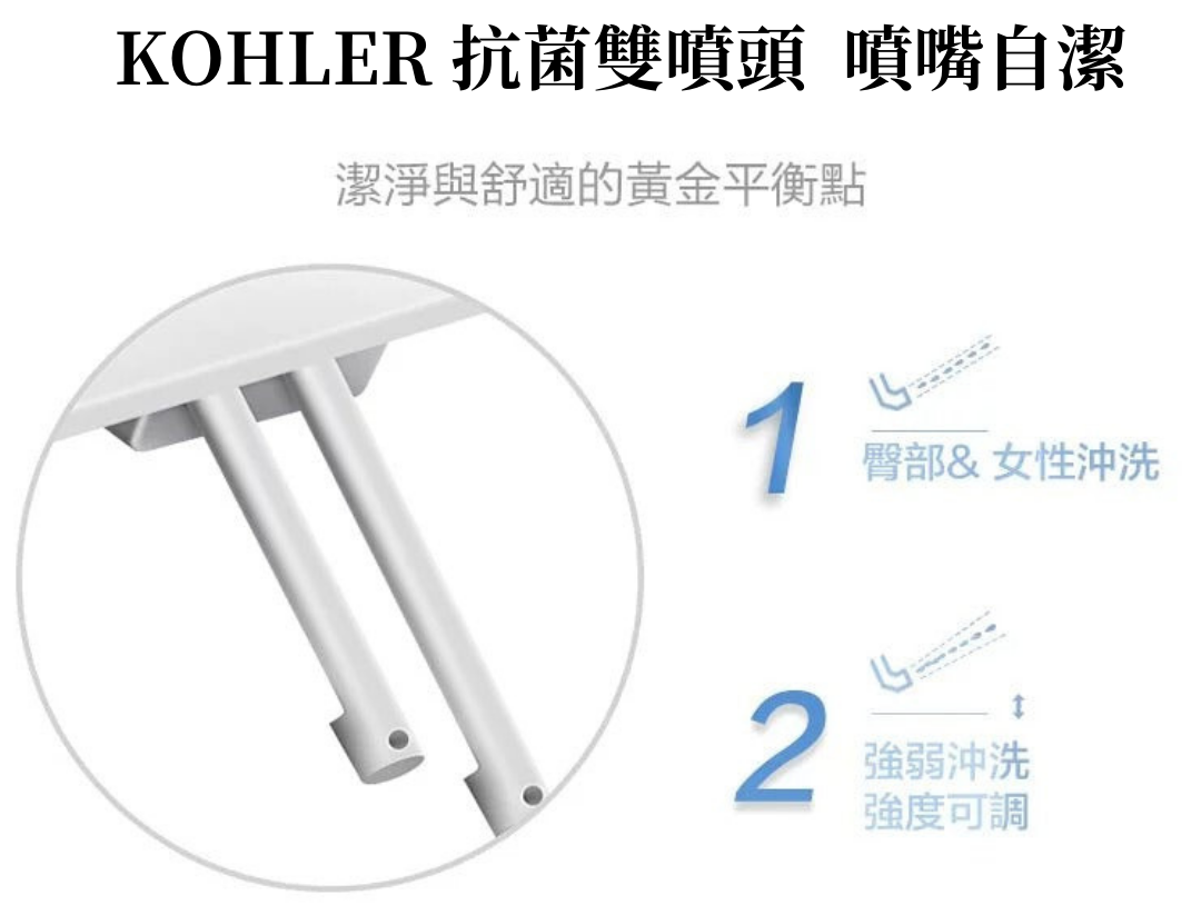 • KOHLER 免治馬桶蓋:316/304不銹鋼或抗菌材質噴嘴,提供更高的耐用性和衛生標準,有效抑制細菌滋生