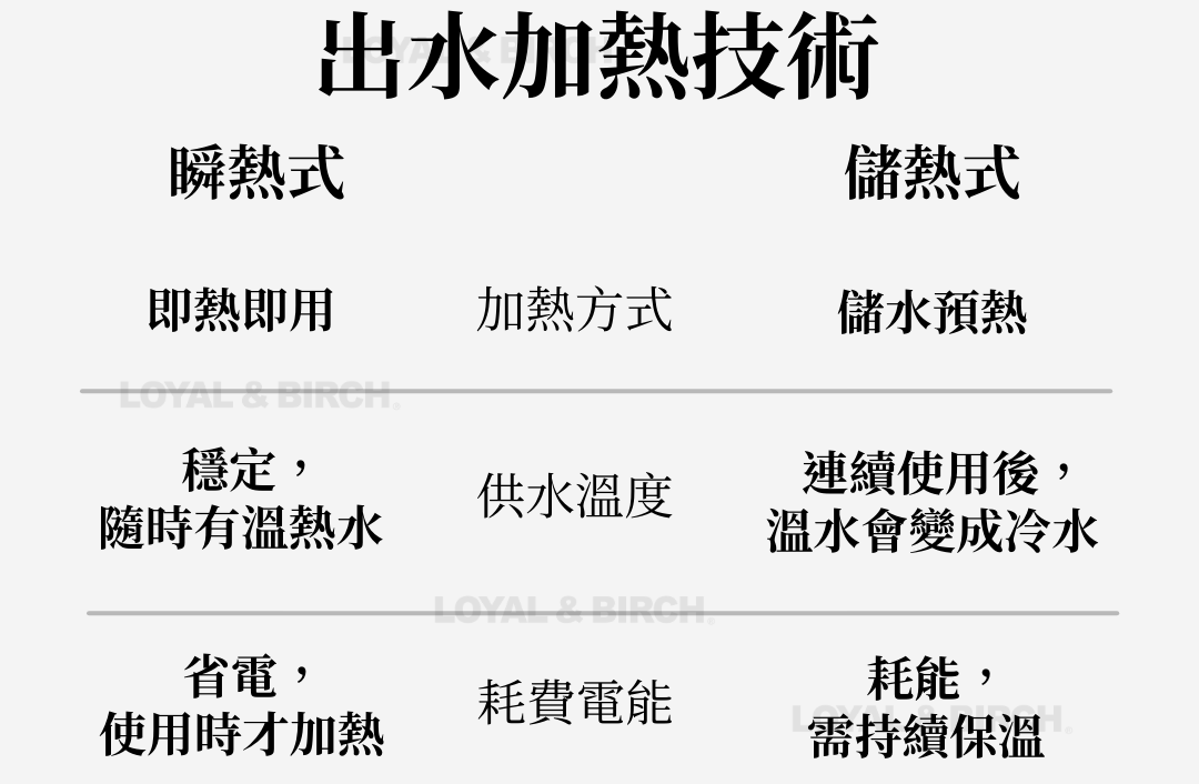 ➊ 加熱方式:水流即用即熱,不需要預先儲水,能避免水箱細菌滋生