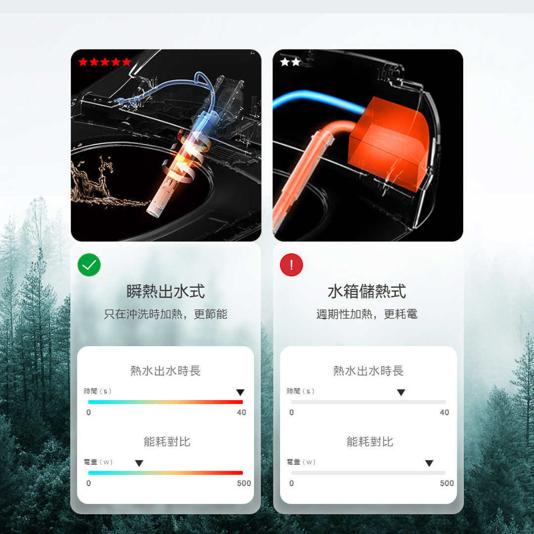 • 傳統免治馬桶蓋:多數使用儲熱式加熱機制,須預先儲水在水箱加熱