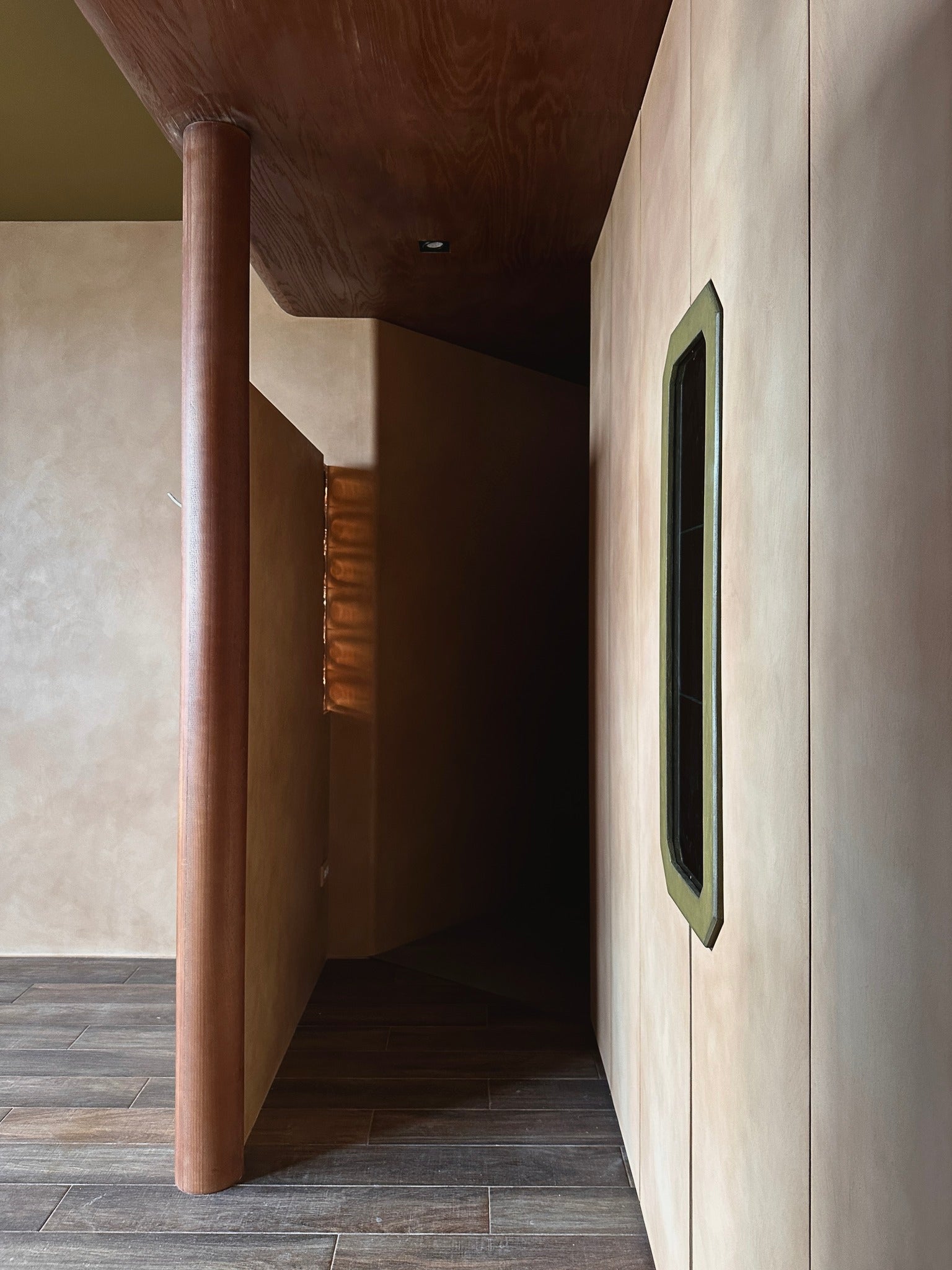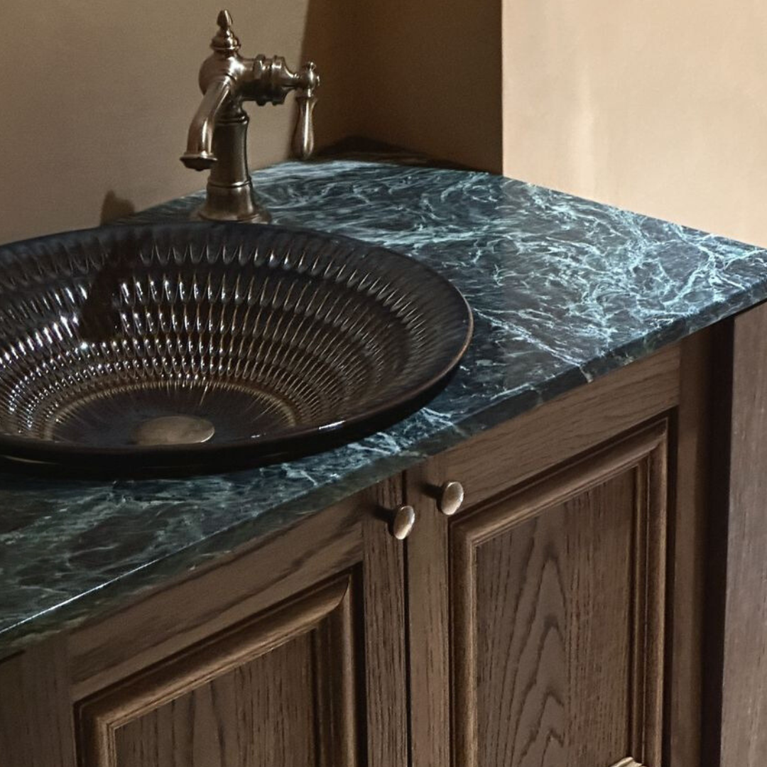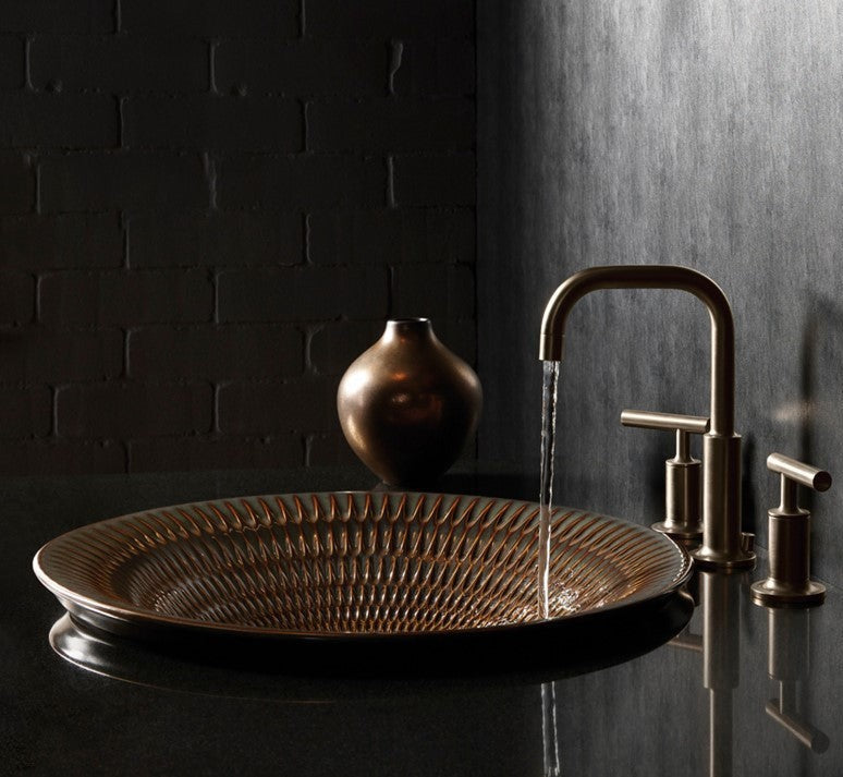 在現代衛浴設計中,銀白色系已不再是唯一選擇。執見設計大膽選用KOHLER Derring上崁藝術盆,為空間注入獨特的藝術氣息。以珍稀的金紅石釉製成,手工雕刻的紋理巧妙凸顯出釉面的色調變化,每一顆都獨一無二,宛如藝術品般精緻。設計師更是透過優雅的祖母綠石紋檯面,營造出豐富的層次感,讓整個空間充斥著優雅氛圍。